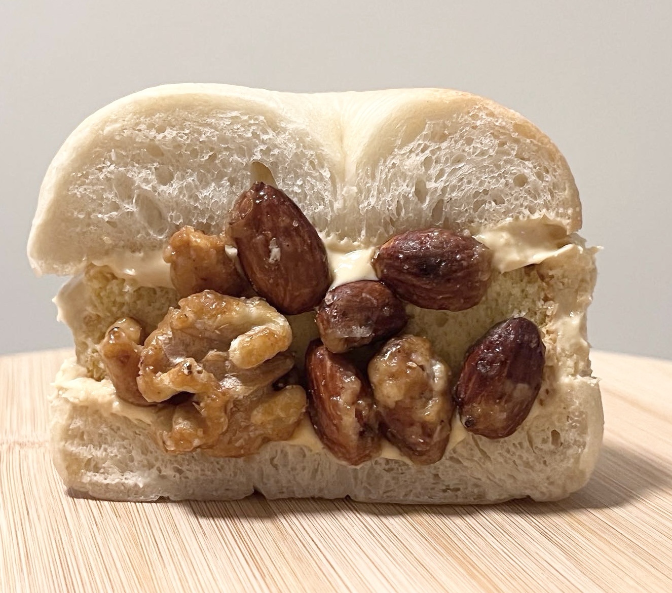 プレーン生地にケーキ、キャラメルクリームチーズをサンド トッピングにキャラメルナッツ